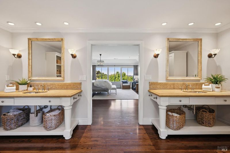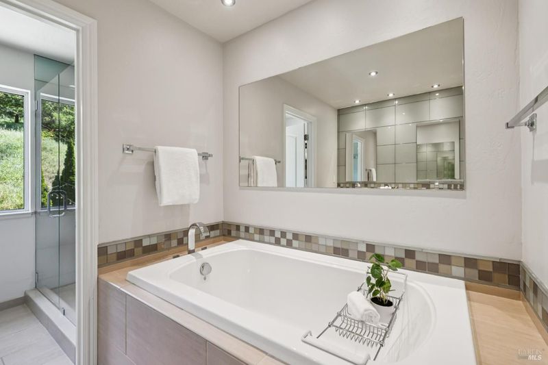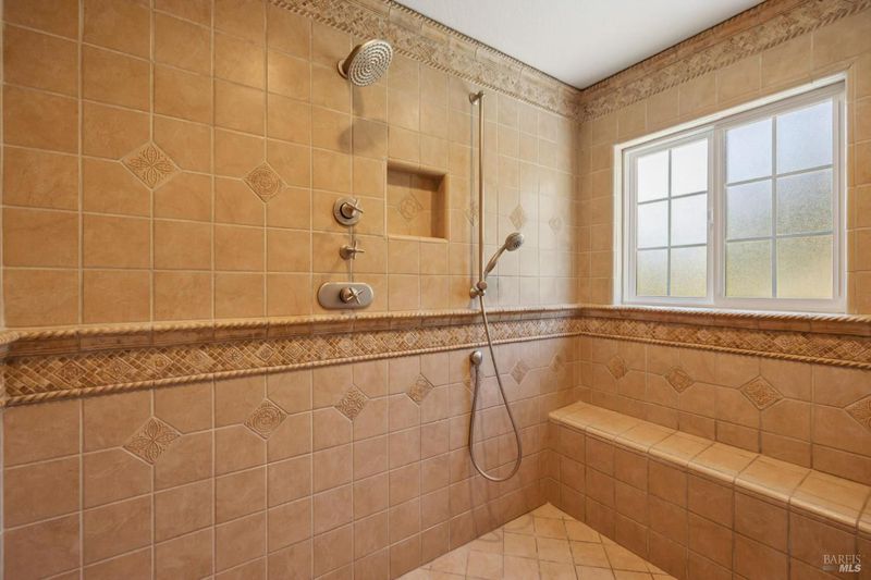 - Double Sinks, Multiple Shower Heads, Shower Stall(s), Soaking Tub, Stone, Window