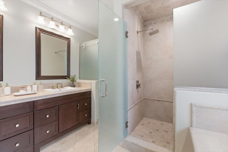 - Double Sinks, Stall Shower, Shower and Tub, Tile, Primary - Stall Shower(s), Primary - Tub with Jets
