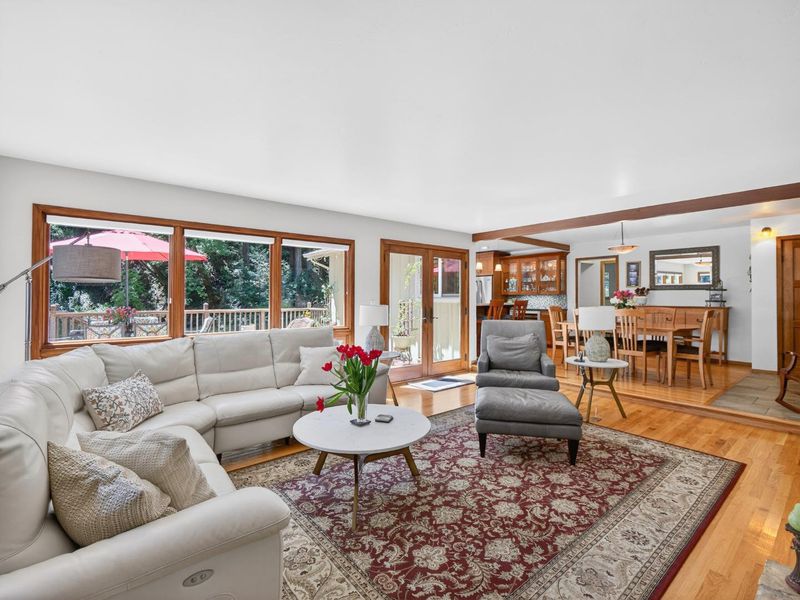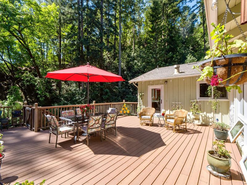 Charm abounds in the Custom home on 3/4 acre. Beautiful Redwood setting, home is in an open clearing with good sun, large deck for entertaining, open floorplan with living, dining, kitchen, two bedrooms & bath upstairs and private ensuite down.