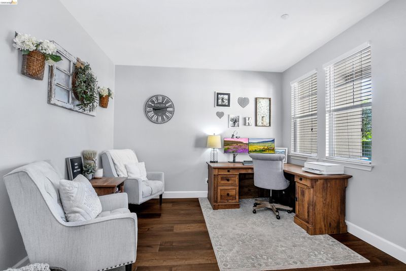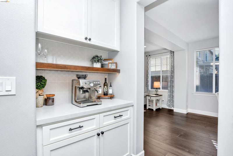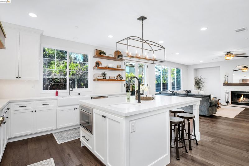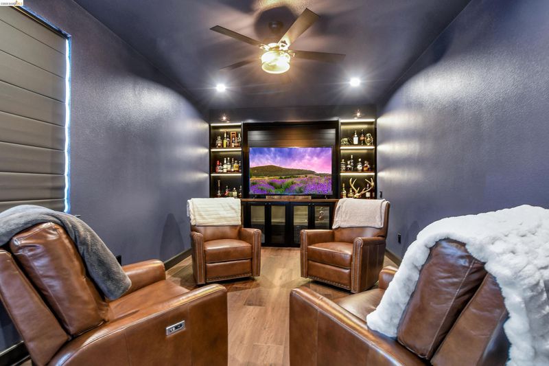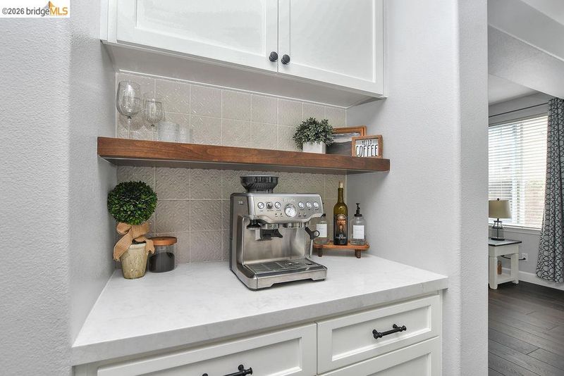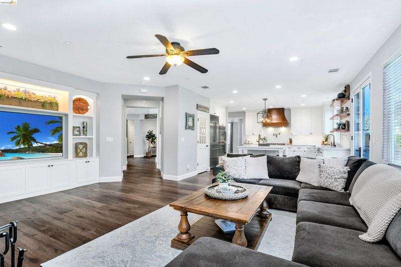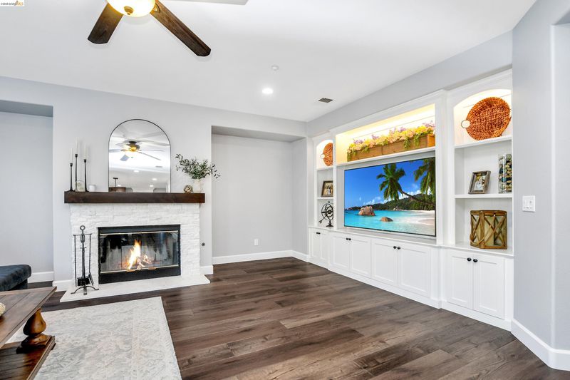 Coveted Montelena home offering elevated living throughout. The downstairs and staircase feature Cortec luxury vinyl plank flooring, creating a seamless, sophisticated look, while fresh baseboards add a crisp finish. Upstairs includes plush new carpeting and refreshed linoleum in the laundry room and bathrooms. The kitchen is a true showpiece, highlighted by a statement wood range hood, floating shelves, and matching mantel in the adjoining family room. Custom cabinetry extends to the ceiling, enhancing scale, with under cabinet lighting for added ambiance. The extended island is perfect for gathering, complemented by a full suite of Thermador appliances, including a 6-burner gas range, double oven, built in refrigerator, microwave drawer, and dishwasher. Designer finishes include quartz countertops, pot filler, chandelier, and full height backsplash. A walk-in pantry with custom cabinetry adds both style and storage. The family room opens to the backyard through French doors with retractable screens for indoor outdoor living. Additional features include dimmable recessed lighting, media lounge with a built-in, and an upstairs loft for flexible living space. Enjoy thoughtful upgrades, quality craftsmanship, and a layout designed for comfort and entertaining.