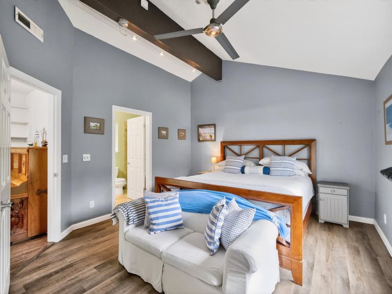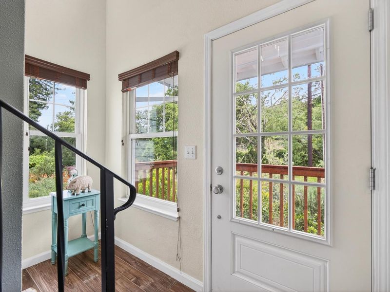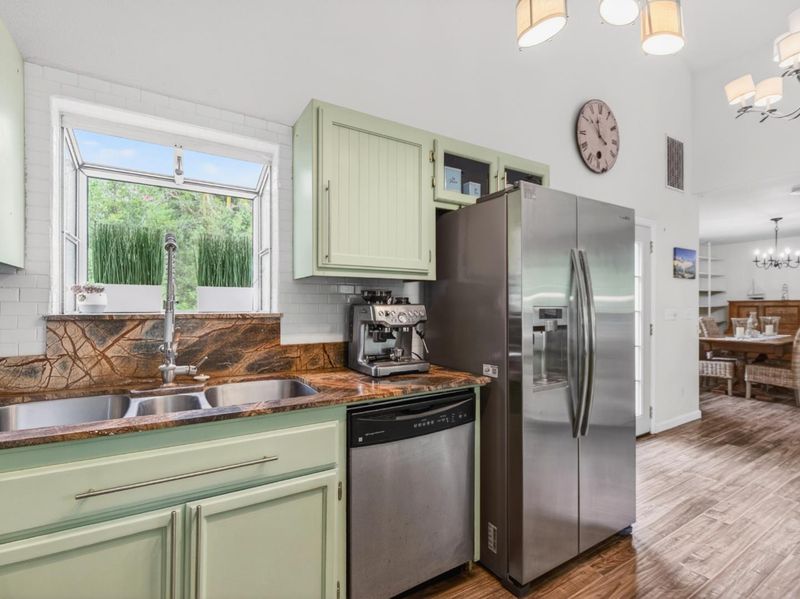 The South African-inspired landscape greets you as you arrive to this beautifully appointed home which offers a perfect blend of comfort, style, and unique outdoor charm. Inside this 3 bed 2 bath home is a thoughtful mix of laminate and hardwood flooring, with plush carpeting in the bedrooms for added warmth. Colorful tiled stairs take you up to the living area. The kitchen is both elegant and functional, featuring a marble countertop, stainless steel sink, appliances, spacious pantry, and an open floor plan that flows seamlessly into the living area ideal for both everyday living and entertaining. The living room boasts high ceilings and a cozy fireplace, creating a bright yet inviting atmosphere. Double doors from both kitchen and living room open onto a generous deck, effortlessly extending your living space outdoors. Step outside to experience a truly special setting. A heated swim spa with high-flow jets offers the perfect setup for relaxation or lap swimming. The property is also home to an impressive collection of 55 olive trees along with a variety of fruit trees, offering both beauty and abundance. Additional highlights; 2 car garage, plus Level 2 EV charger, combining modern convenience with sustainable living. Easy access to freeway, beaches, restaurants and schools!