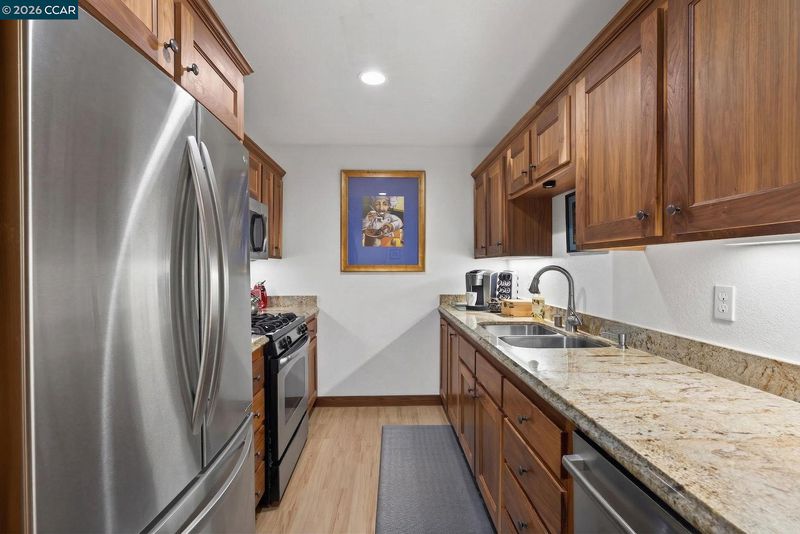 Don’t miss this exceptional ground-floor, level-in unit in a quiet location. The spacious private patio is perfect for entertaining and gardening. Enjoy two reserved parking spaces—one covered, one uncovered—just steps from your door. The kitchen features Black Walnut cabinetry, granite countertops, laminate floors, stainless steel appliances, and under-cabinet lighting. The hall bath offers vinyl plank flooring, while the main bedroom has a private bath with a walk-in shower and custom Cherry Wood vanity. Berber carpeting adds comfort throughout, and double-pane windows plus plantation shutters ensure style and energy efficiency. Laundry hookups are included. The development offers a pool, clubhouse, play area, and landscaped grounds. Conveniently located near shopping, transportation, parks, and schools, this home provides tranquility and beauty—don’t miss out!