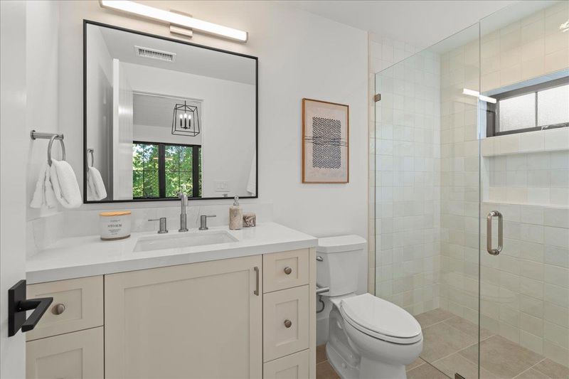 - Double Sinks, Full on Ground Floor, Half on Ground Floor, Primary - Oversized Tub, Primary - Stall Shower(s), Shower over Tub - 1, Solid Surface, Stall Shower - 2+, Tile
