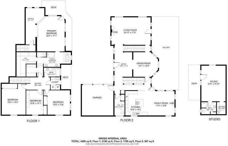 - Family Room, Gas Burning, Living Room, Primary Bedroom, Wood Burning