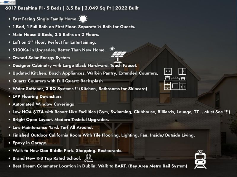 Back on the market! This clean, better-than-new, east-facing large single-family home in Boulevard features over $100K in designer upgrades and offers 5 bedrooms, 3.5 bathrooms, and 3,049 sq. ft. of living space. The main house spans two floors with 5 bedrooms and 3.5 baths, plus a spacious loft on the third floor that is perfect for entertaining. At street level, you’ll find 1 bedroom, 1 full bath, a separate half bath for guests, along with the kitchen, living, dining areas, and California rooms. A finished modern California room seamlessly extends indoor-outdoor living. The upgraded kitchen includes designer cabinets, an island, Bosch appliances, and a walk-in pantry. Upstairs, the primary suite features a luxurious bath, shower, and dual vanities, along with three additional bedrooms and a shared bath, making it ideal for families or a home office setup. The large open loft is perfect for a game room, entertainment space, kids’ area, or hobby room. This smart home includes multi-zone HVAC and voice-activated motorized blinds, a low-maintenance backyard with turf, and an attached two-car garage with epoxy floors. Additional upgrades include owned solar, a whole-house water softener, and three reverse osmosis (RO) systems in the kitchen and bathrooms. Enjoy a low HOA and access to the Boulevard community’s resort-style amenities, including an Olympic-size pool, modern party halls, game rooms, lounges, a gym, and parks. The home is within walking distance to Don Biddle Park, trails, shopping, and BART transportation, and a brand-new K–8 school within the community further enhances its value. Don’t miss this perfect home for families seeking the Bay Area lifestyle with convenient access.